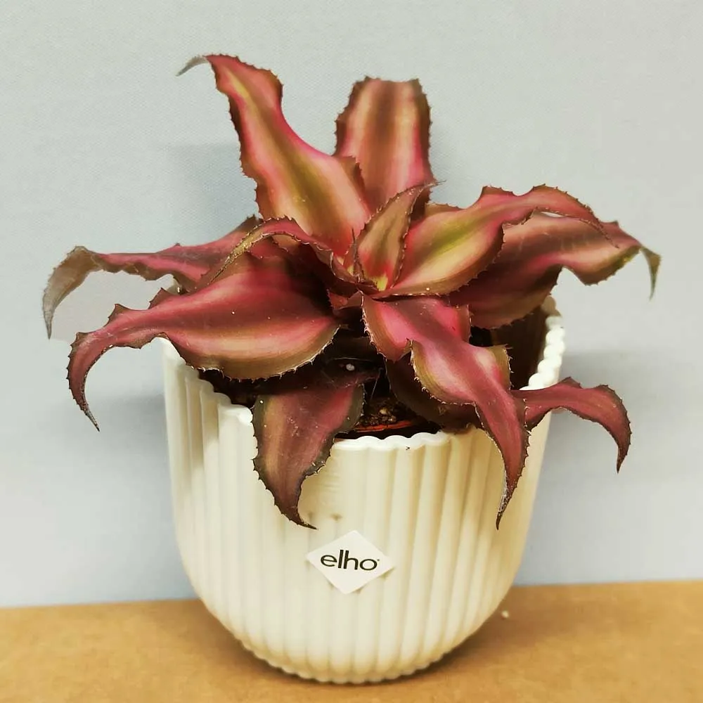 Cryptanthus Bivittatus Red Starlight è una pianta della famiglia delle Bromeliaceae originaria del Brasile. La caratteristica principale di questa pianta è il naturale colore rosso intenso delle sue foglie, che la rendono molto decorativa ed apprezzata dagli appassionati di piante succulente, tale colorazione durante il riposo vegetativo schiarisce, ma ritorna vivida appena riprende la stagione vegetativa. Le foglie sono rigide e carnose: formano una rosetta completamente liscia, senza spine o dentellature ed è di piccole dimensioni. Nonostante il forte impatto decorativo è una pianta comunque rustica e facile da coltivare, adatta anche a chi si avvicina per la prima volta al mondo delle piante grasse. La Cryptanthus Red Starlight è ideale da coltivare in vaso proprio perchè molto affascinante ed originale, perfetta per dare un tocco di colore alla tua casa o al tuo ufficio.
