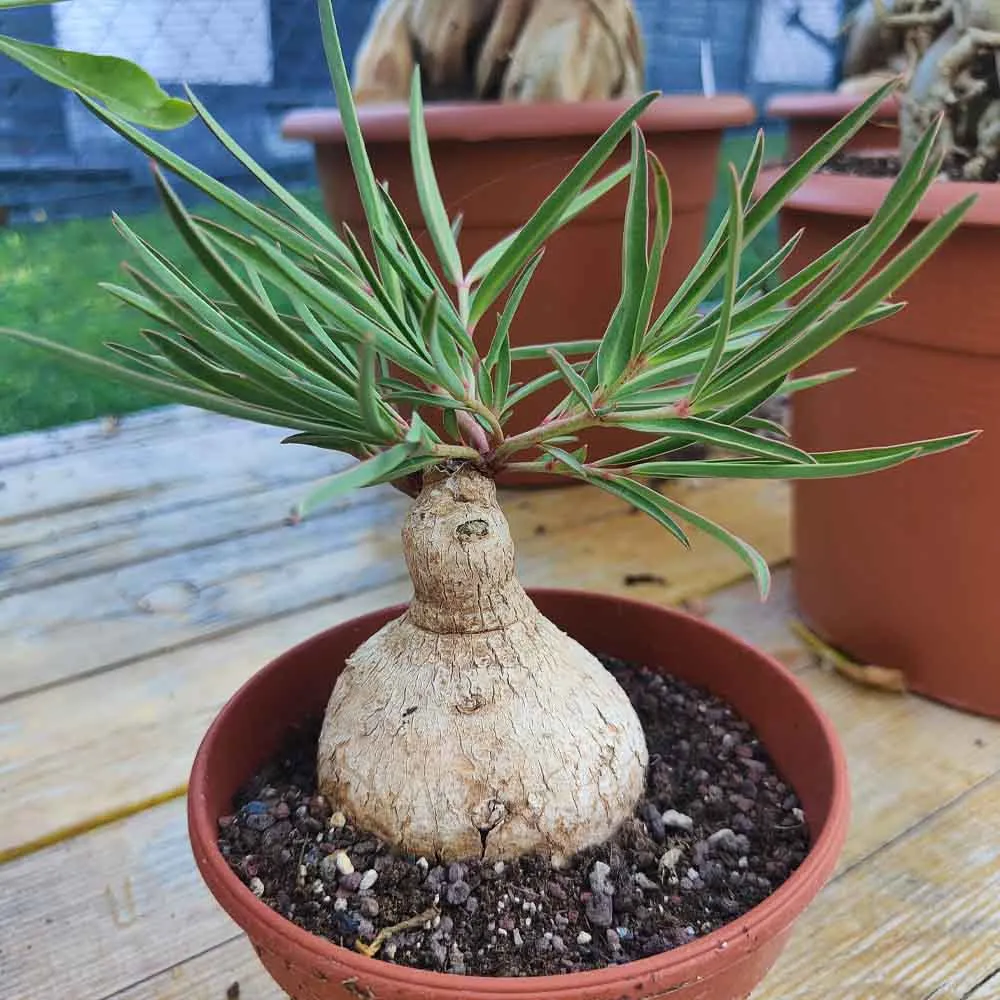 L’ Euphorbia trichadenia è una pianta caudiciforme originaria del Sud Africa: caudex raro da collezione a fusto tuberoso spesso a forma semiglobulare con aspetto legnoso e questo solitamente è posizionato sottoterra e funge da magazzino per l’ acqua, mentre steli e chioma escono dal terreno in fase vegetativa. Proprio i fusti sono molto lunghi e portano foglie obvallate di colore verde intenso e vengono perse durante il periodo di riposo vegetativo. In primavera i fiori partono dalle ascelle delle foglie formando piccoli ciazi verde chiaro giallastro.
