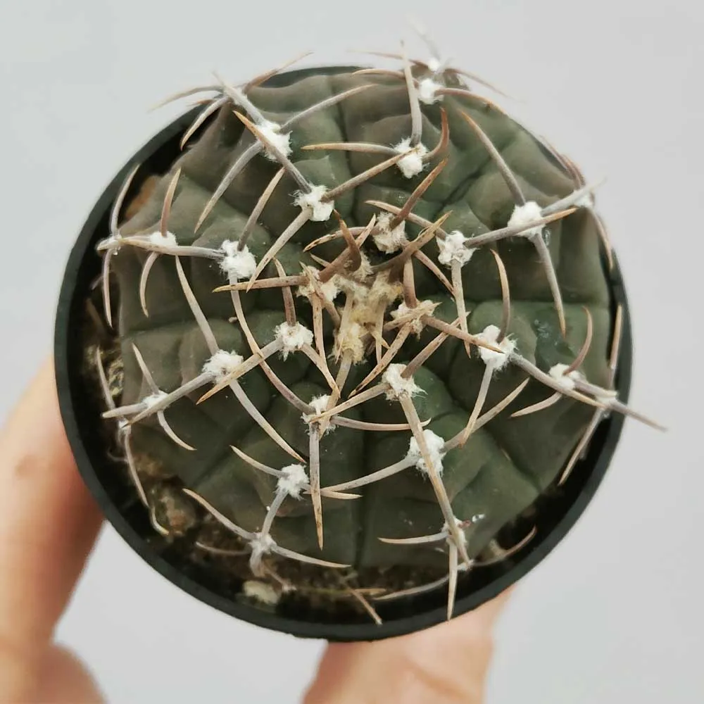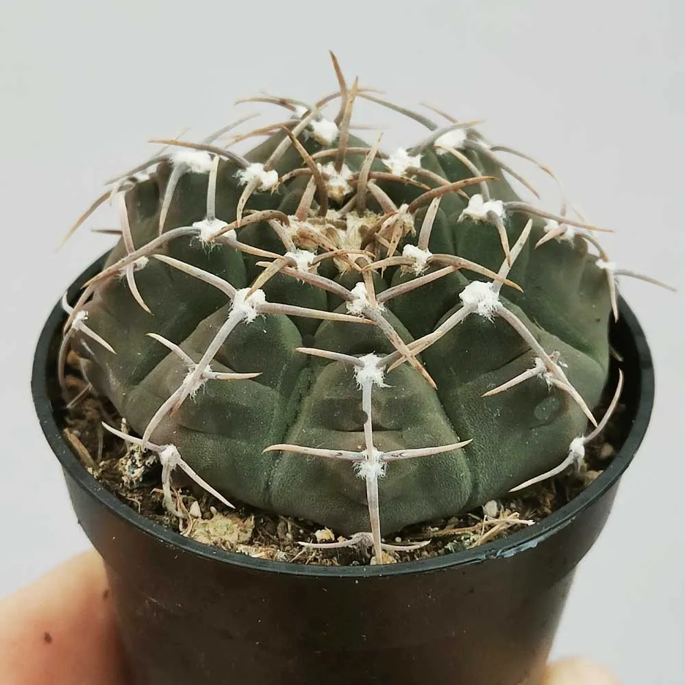 Il portamento del Gymnocalycium vatteri è globulare o leggermente depresso-globulare, con un fusto che raramente supera i 10 cm di diametro e i 9 cm di altezza. Il colore del fusto varia dal verde scuro al verde-bluastro o grigio-verde, a seconda delle condizioni di crescita e dell’esposizione al sole. La superficie del fusto è caratterizzata da 11-14 costolature larghe, poco prominenti e leggermente tubercolate, che conferiscono alla pianta un aspetto segmentato e ondulato. Le areole, situate lungo le costolature, sono lanose e di colore bianco-grigiastro. Le spine sono rigide, corte (1-2 cm di lunghezza), appiattite e ripiegate verso il corpo del cactus, offrendo una certa protezione dai raggi solari e dagli erbivori. Il numero di spine per areola varia da 1 a 3, ma alcune areole possono essere completamente prive di spine, una caratteristica distintiva di questa specie. La variabilità nella spinagione è una delle ragioni per cui il Gymnocalycium vatteri è apprezzato dai collezionisti.