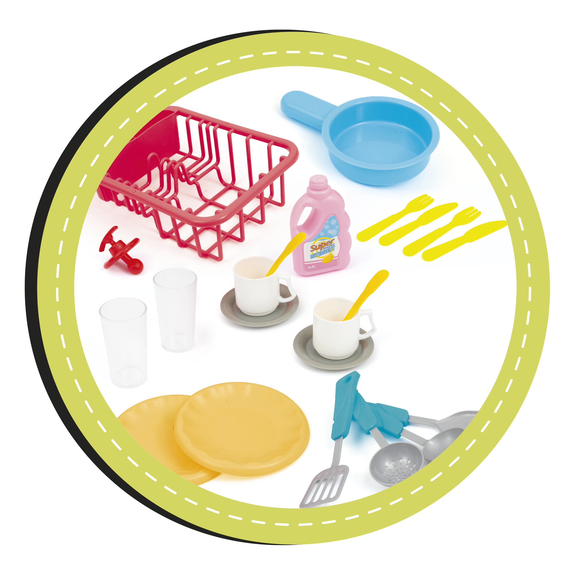 Immagina un lavello realistico con acqua che scorre, progettato per i piccoli esploratori domestici. Questo set include ben 23 accessori, come scolapiatti, tappo, tazze, piattini, utensili da cucina e molto altro, perfetti per avvicinare i bambini al mondo della casa in modo divertente e educativo.