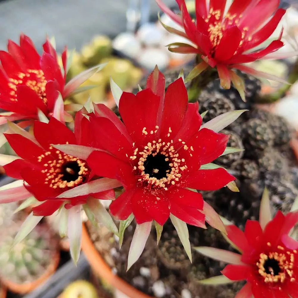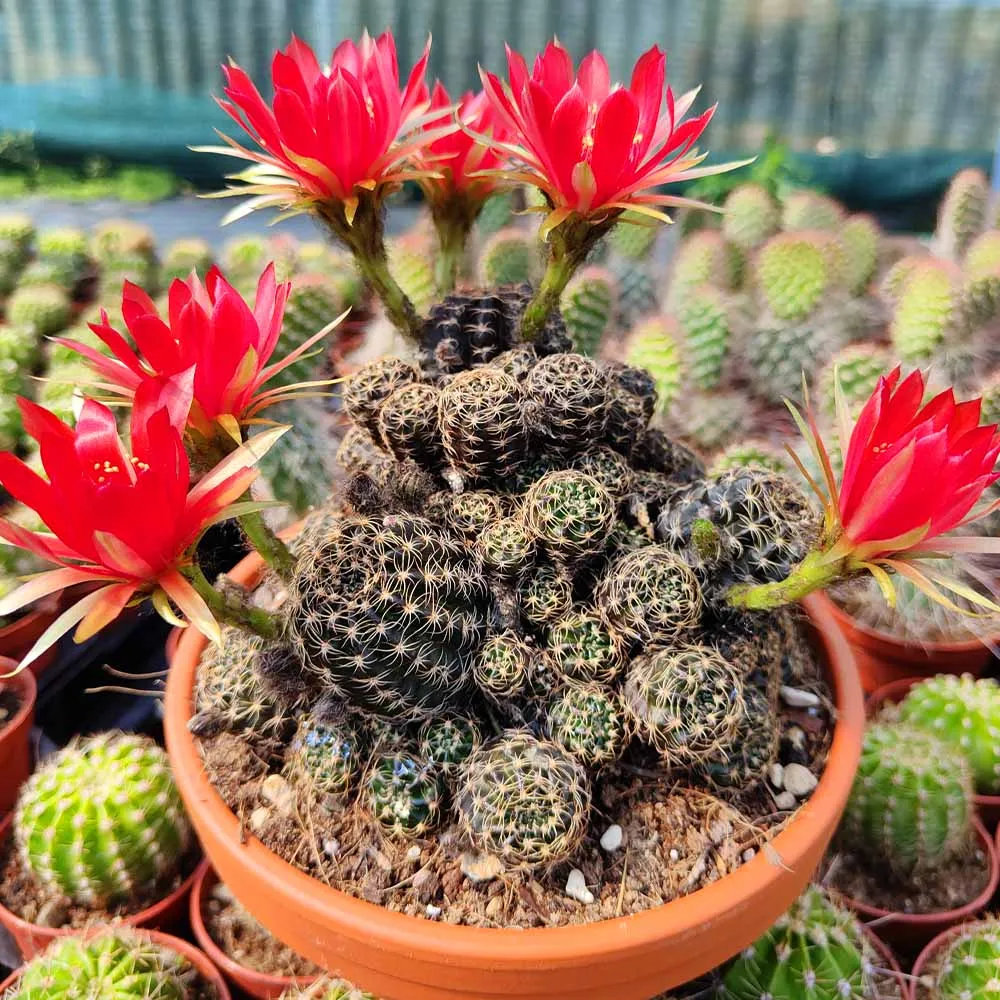 La Lobivia Arachnacantha, facente parte in realtà del genere Echinopsis, è una pianta grassa caratterizzata da aspetto bizzarro e “torreggiante” perché tende ad accestire e formare gruppi molto facilmente e velocemente. I suoi fusti, dai toni verde scuro o bruni, sono di forma semiglobulare con apice leggermente depresso cosparso da fitte e piccole spine recurve non prominenti e per lo più innocue: il punto di forza di questo cactus sono sicuramente le numerose e bellissime fioriture che possono variare da rosso, giallo all’ arancio. Una pianta davvero molto semplice nella coltivazione che regala fin da subito grosse soddisfazioni (ebbene sì fin da piccolissima è in grado di fiorire).