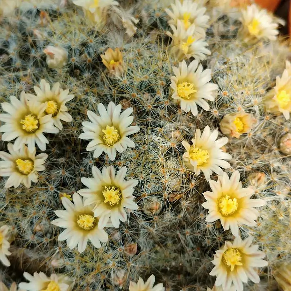 La Mammillaria prolifera è un cactus originario degli Stati Uniti e Caraibi, dal portamento compatto quasi a formare “cuscini”; i suoi fusti sono globulari e di colore verde con tubercoli conici alla cui apice spuntano piccole e brevi spine beige o rossastre, mentre le conche sono lanose e le donano un aspetto quasi “cotonoso”. I fiori di questa simpatica pianta grassa sono piccoli ma davvero abbondanti simili a margherite e ricoprono tutta la pianta come un prato; le infiorescenze durano tutta la primavera e sono uno spettacolo davvero unico, ma la vera sorpresa è ciò che avviene dopo la fioritura: i semi sono rossi, di forma oblunga e sulla pianta durano parecchi mesi portando un contrasto davvero unico. Cactus che tende a svilupparsi mediamente in orizzontale formando delle colonie e la sua altezza massima non supera i 15cm; facile da coltivare e per lo più non richiede alcun particolare sforzo.