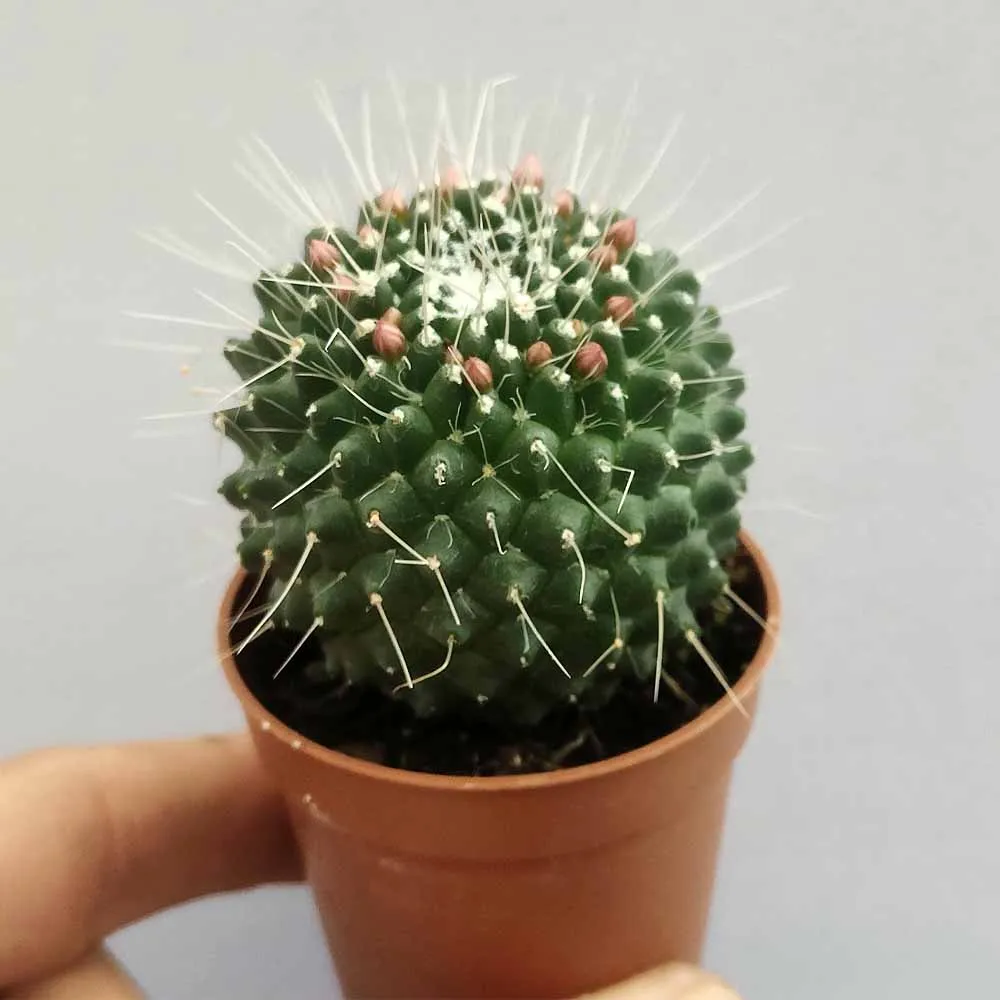 La Mammillaria spinosissima cv ‘Un Pico’ è una cultivar nana della Mammillaria spinosissima, apprezzata per la sua forma compatta e la sua fioritura a corona. Originaria delle regioni più asciutte del Messico, questa pianta grassa appartiene alla famiglia delle Cactaceae e si distingue per il suo fusto globoso, le sue spine bianche e sottili e i suoi fiori rosa che sbocciano in primavera, formando una corona attorno all’apice del fusto. Il nome “Un Pico” si riferisce alla singola spina centrale che si sviluppa in ogni areola, a differenza della specie tipica che presenta numerose spine.