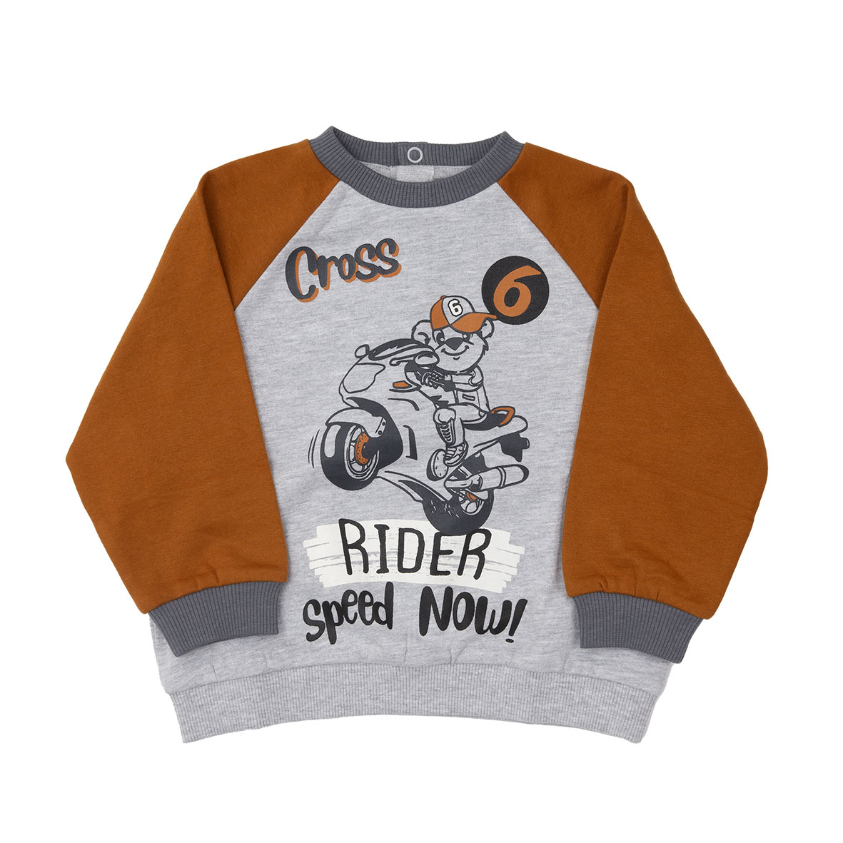 Maglia in morbida felpa garzata, manica raglan in colore grigio melange e marrone con stampa. L’apertura sul retro rende agevole indossare il capo.