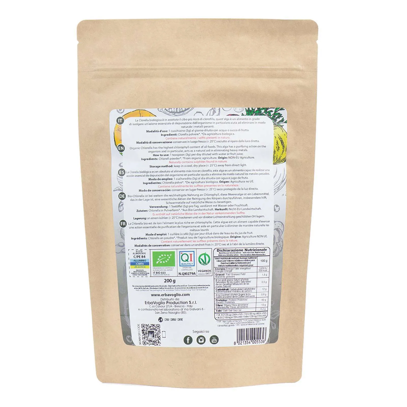 La polvere di Clorella è ottenuta tramite essiccazione e polverizzazione della micro-alga verde. Proveniente da agricoltura biologica, è completamente priva di additivi e coloranti. Si dissolve facilmente in acqua o succo di frutta, rendendola comoda da consumare.