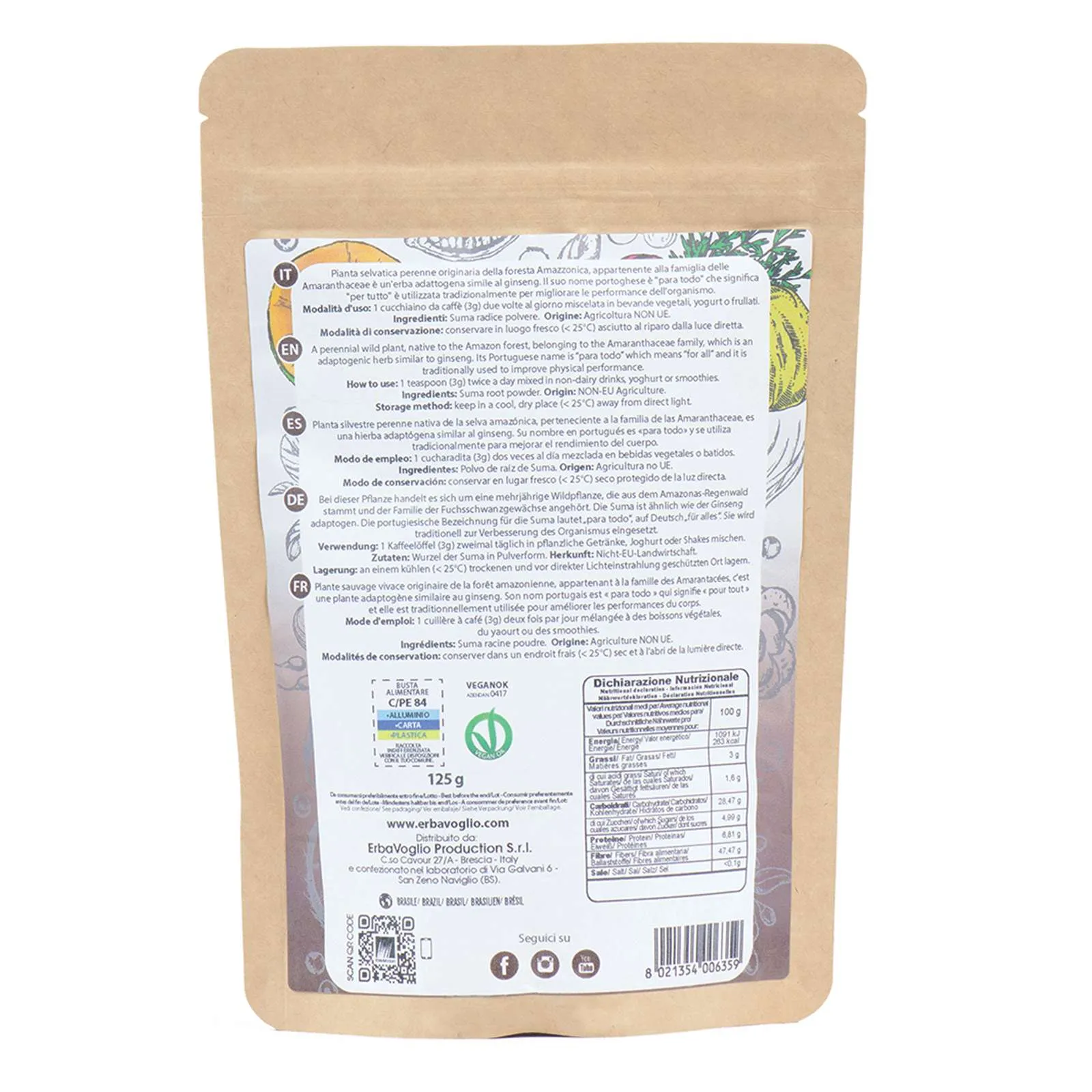 Studi scientifici hanno evidenziato la presenza di saponine nella Suma, riconosciute per le loro proprietà antiossidanti. Questa pianta contiene microelementi come ferro, magnesio, zinco, vitamine del gruppo B, vitamina E e K, e germanio, che contribuiscono al benessere generale dell’organismo. Nella medicina tradizionale dell’Amazzonia, la Suma è utilizzata come tonico e stimolante. Le sue radici, ricche di aminoacidi, sono apprezzate da chi segue diete vegetariane e vegane, oltre che dagli sportivi.