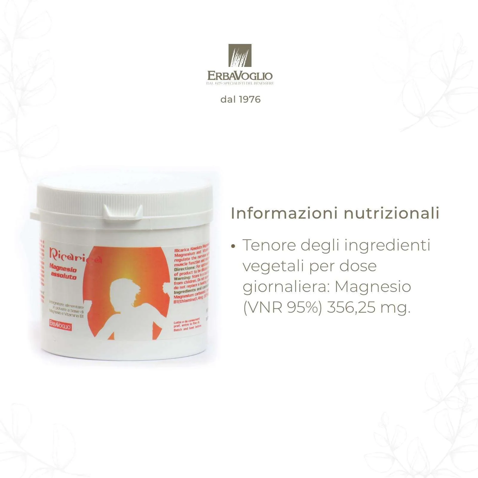 Magnesio e vitamina B1 contribuiscono al normale funzionamento del sistema nervoso e al metabolismo energetico. Il Magnesio promuove rilassamento e contribuisce a ridurre stanchezza e spossatezza.COME FUNZIONAIl Magnesio è un cofattore per il benessere in generale. Coinvolto in centinaia di funzioni biochimiche e classificato come macro minerale, è anche un elettrolita in grado di condurre corrente elettrica una volta disciolto in una soluzione liquida come l’acqua. Le funzioni del Magnesio si estendono a tutti i sistemi del corpo, dal sistema nervoso a quello scheletrico e muscolare, dalla co-produzione di ormoni alla regolarità del ritmo cardiaco, nel metabolismo dei lipidi, delle proteine e dei glucidi e permette la produzione di energia. Favorisce il mantenimento di un pH equilibrato nel sangue, regola il ritmo cardiaco e ha un’azione vasodilatatrice. Consolida la formazione e crescita delle ossa. La vitamina B1 idrosolubile, tiamina, appartiene al complesso B ed é associata al metabolismo dei carboidrati, al benessere del sistema nervoso, muscolare ed energetico.