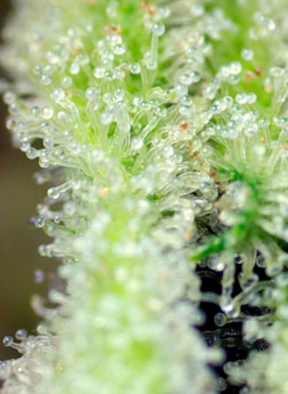 Mostra grandi gemme resinose con tricomi carichi di limonene che le rendono perfette per estratti e concentrati.