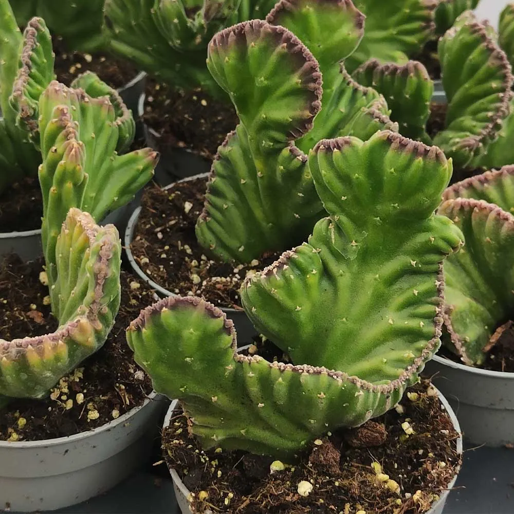 La Stapelia leendertziae crestata è una succulenta davvero eccentrica ed inusuale per forme e portamento, la forma normale è originaria del Sud Africa nel Transvaal ed è famosa per le sue grandi fioriture a campana di colore ebano. Mentre la forma crestata è facilmente riconoscibile per le sue sinuose e morbide evoluzioni che passano dal tipico ventaglio a forme più complesse; veloce nella crescita e particolarmente facile da coltivare è una pianta grassa molto collezionata e ricercata; ha fusti di colore verdi brillante molto robusti e morbidi al tatto per via della finissima peluria di cui sono ricoperti che crestando formano linee rosate e rossastre sugli apici.