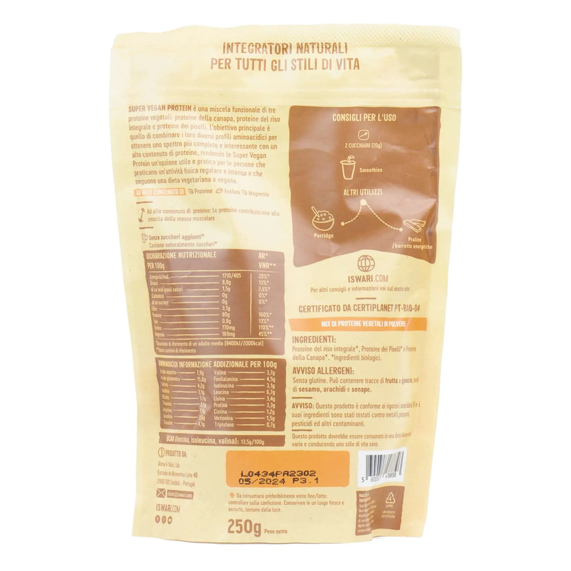 Super Vegan Protein Iswari è una miscela vegana, originale, nutriente, estremamente proteica, facile da digerire e di immediata assimilazione. Il connubio di base delle tre proteine vegetali: Canapa, Riso e Piselli fornisce tutti gli aminoacidi necessari per soddisfare le esigenze metaboliche di sportivi e salutisti in generale fornendo anche un pacchetto completo di molecole antiossidanti. Dal sapore neutro e versatile, è un mix ideale per frullati proteici, zuppe, budini e barrette. Non appesantisce e non crea acidità.