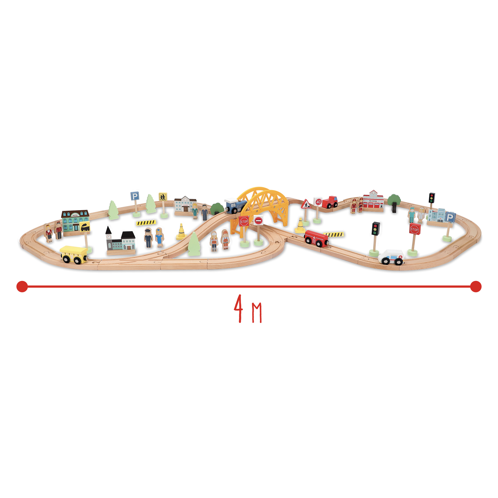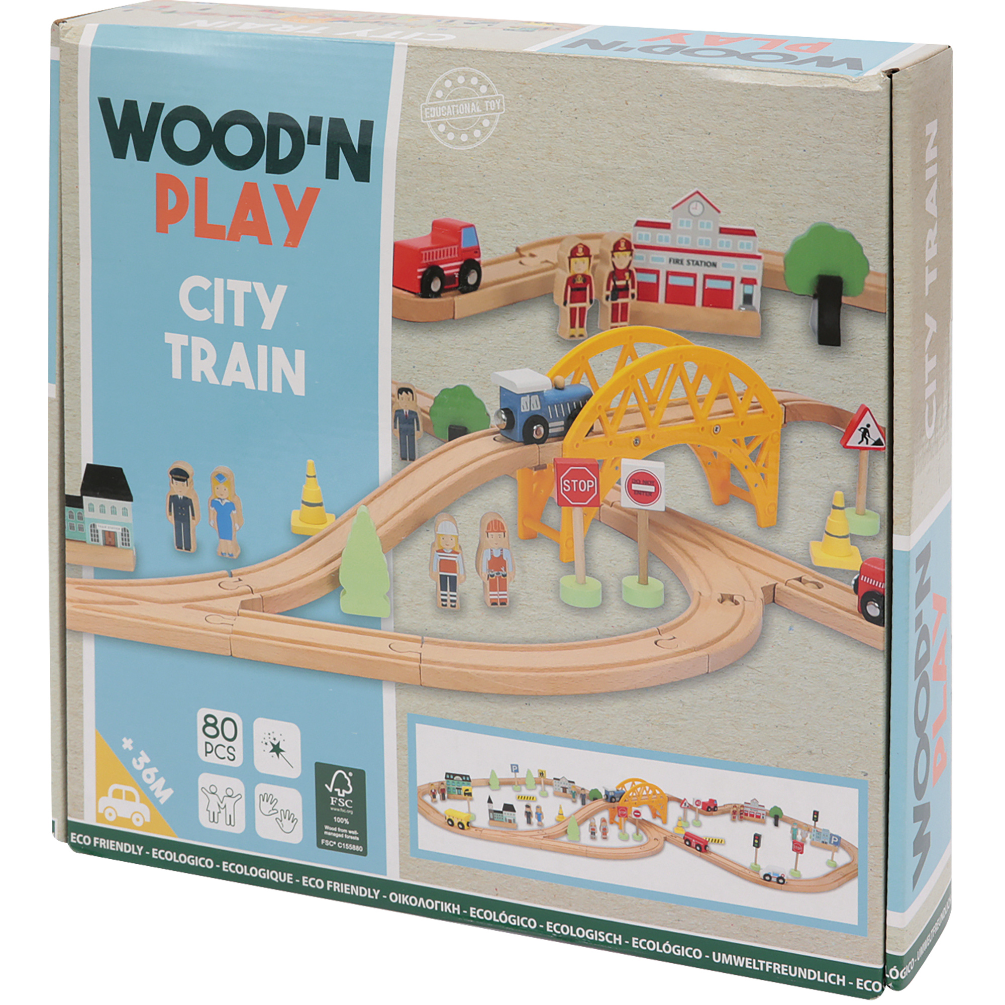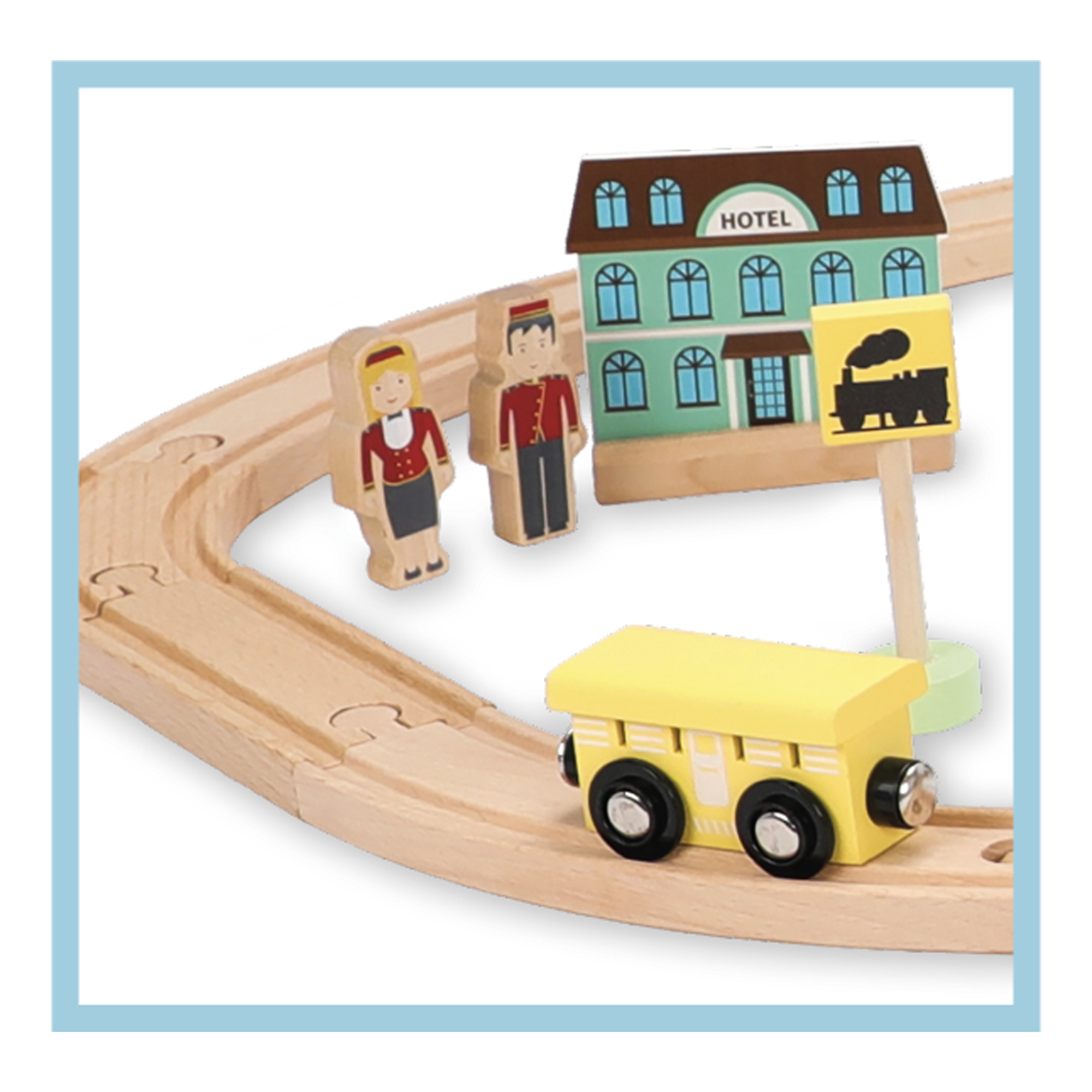 – Il trenino composto da locomotiva e due vagoni, in arrivo alla stazione, sfreccia sui binari, passando sul ponte, e attraversando il centro città, dove trova l’ospedale, la caserma dei pompieri, la scuola e l’albergo.