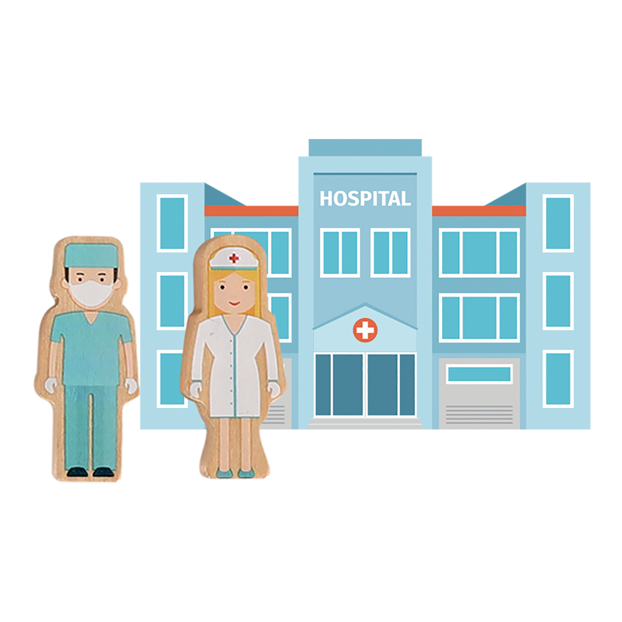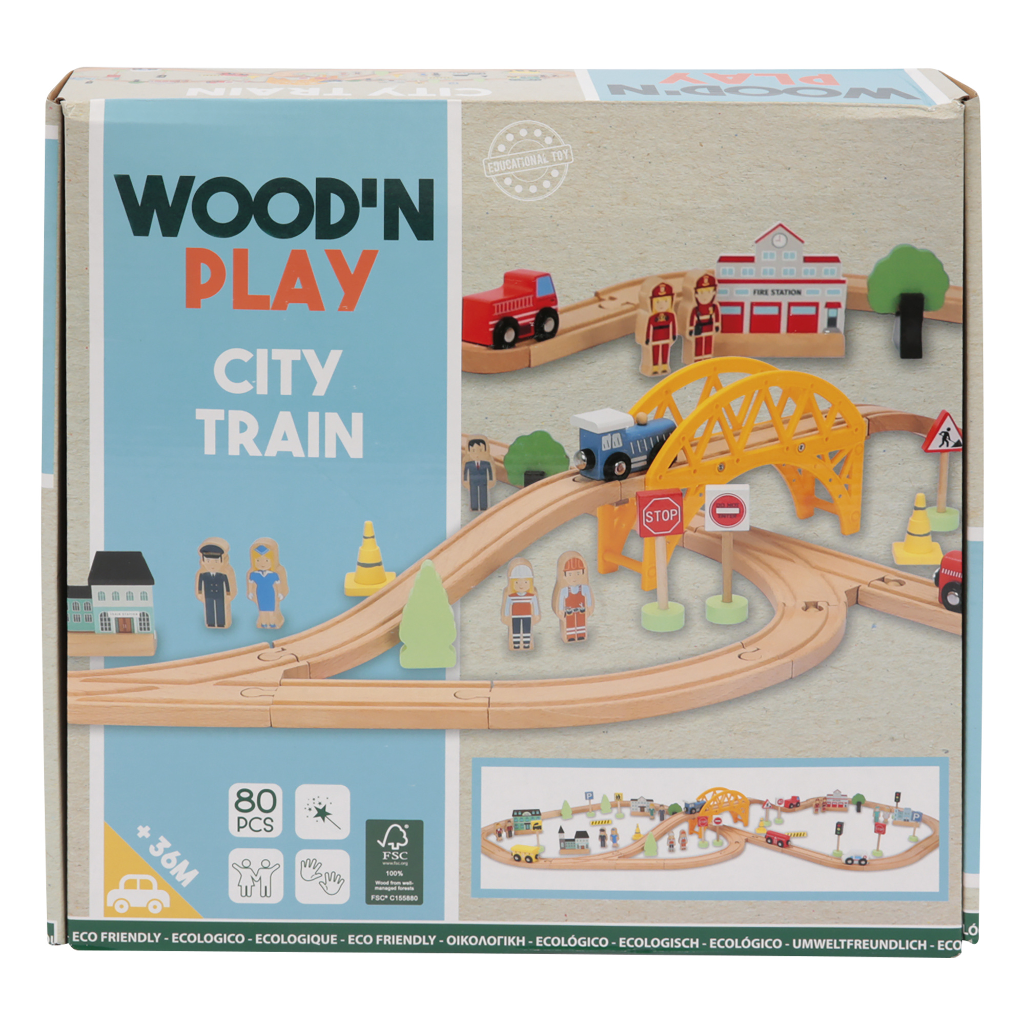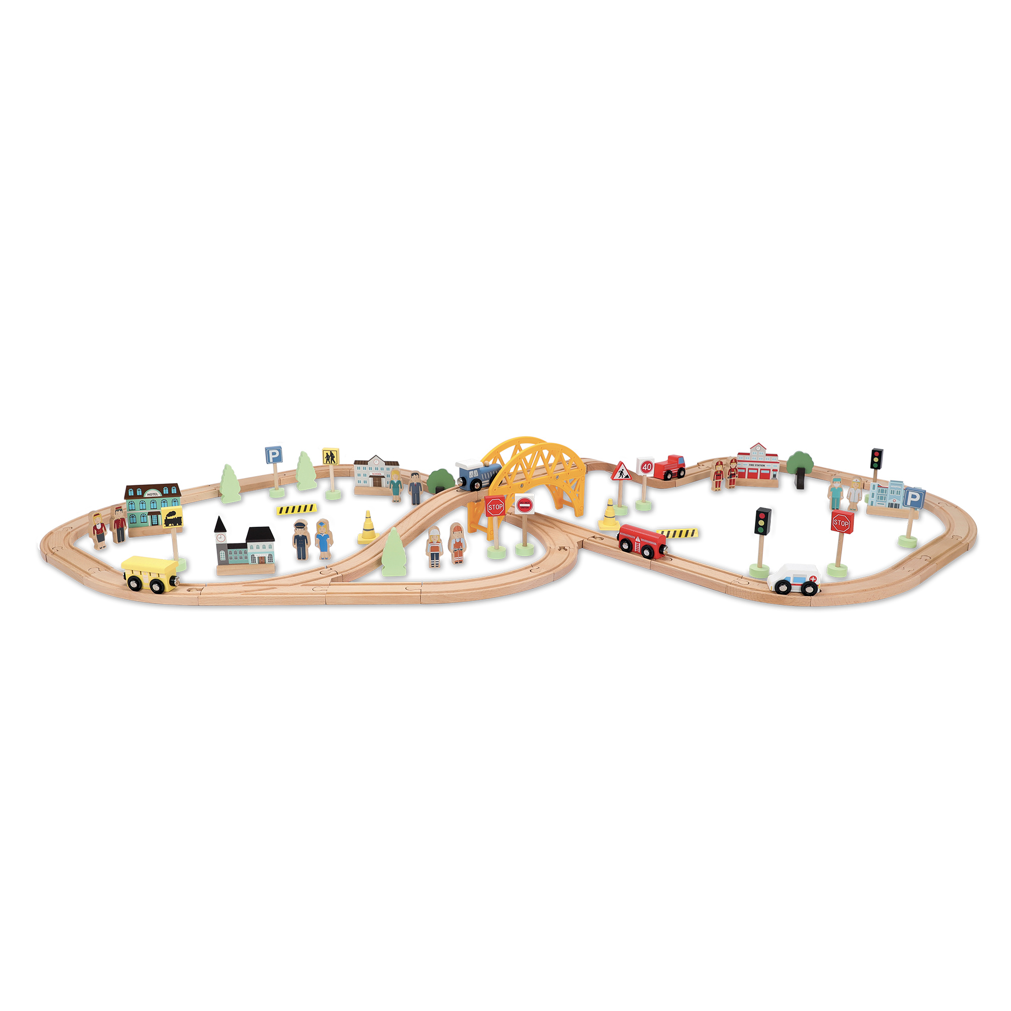 – Il trenino composto da locomotiva e due vagoni, in arrivo alla stazione, sfreccia sui binari, passando sul ponte, e attraversando il centro città, dove trova l’ospedale, la caserma dei pompieri, la scuola e l’albergo.