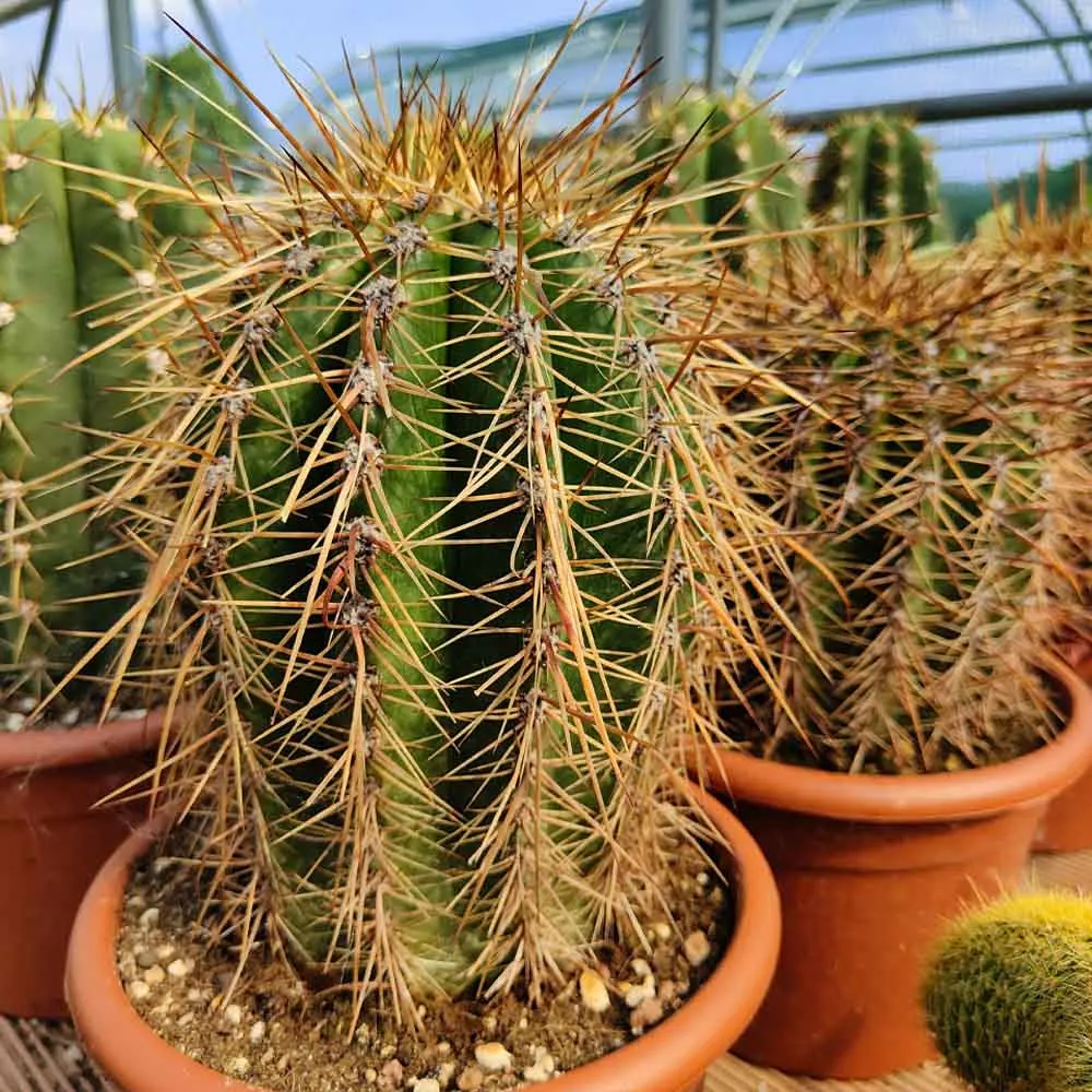 Il Trichocereus terscheckii, comunemente soprannominato “Saguaro Argentino”, è una pianta grassa nativa del Sud America caratterizzato da portamento colonnare normalmente a singolo fusto, ma che con l’ avanzare dell’ età può sviluppare ramificazioni (rendendolo così molto simile ai più ben noti cactus del deserto come Polaskia Chichipe, Pachycereus Pringlei o Carnegia gigantea). La pianta di Trichocereus terscheckii ha corpo molto massiccio di colore verde o verde chiaro con ampie e definite costolature i cui margini sono delineati da lunghe e robuste spine giallo arancioni o nero brunastre; la sua crescita è moderatamente lenta e può raggiungere svariati metri di altezza. Questo importante cactus riesce a sopportare qualche grado sotto lo zero rendendolo perfetto per ambientare anche spazi esterni come giardini, terrazzi, balconi o verande anche in combo con altre piante grasse per ricreare perfetti angoli verdi e suggestivi. In primavera le grosse infiorescenze di questa bellissima pianta grassa si sviluppano al suo apice con grossi fiori bianco o leggermente rosati di forma campanulare.