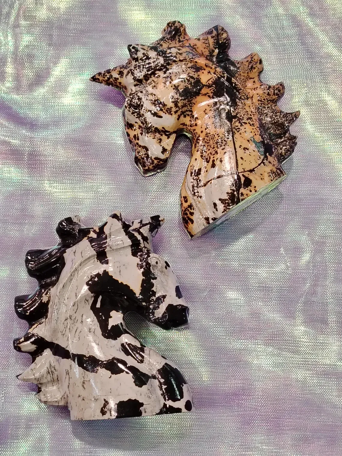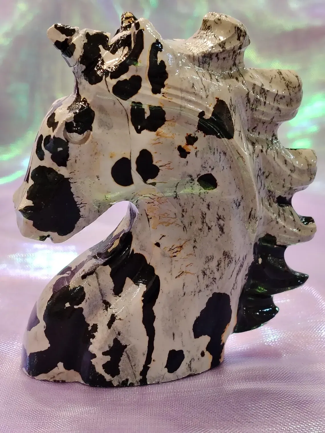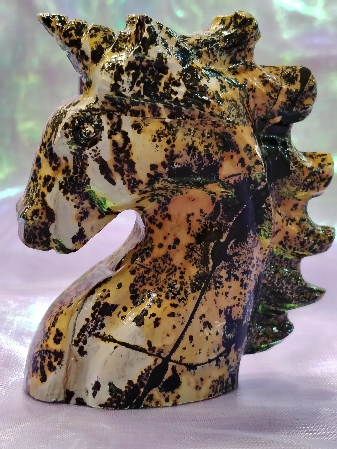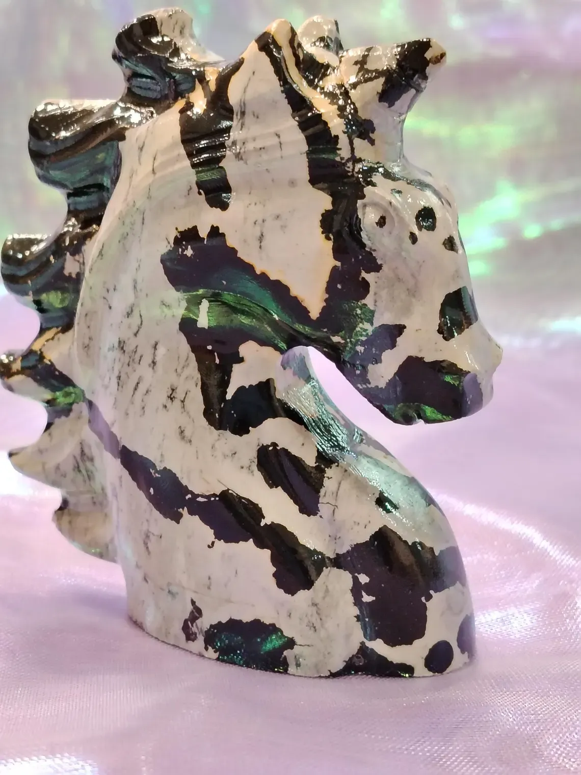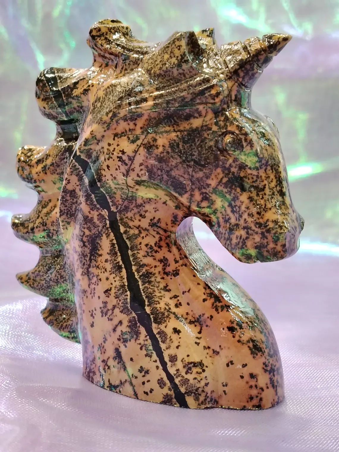 Bellissimo mezzobusto di unicorno finemente intagliato e lavorato, in pietra Diaspro Paesaggio.